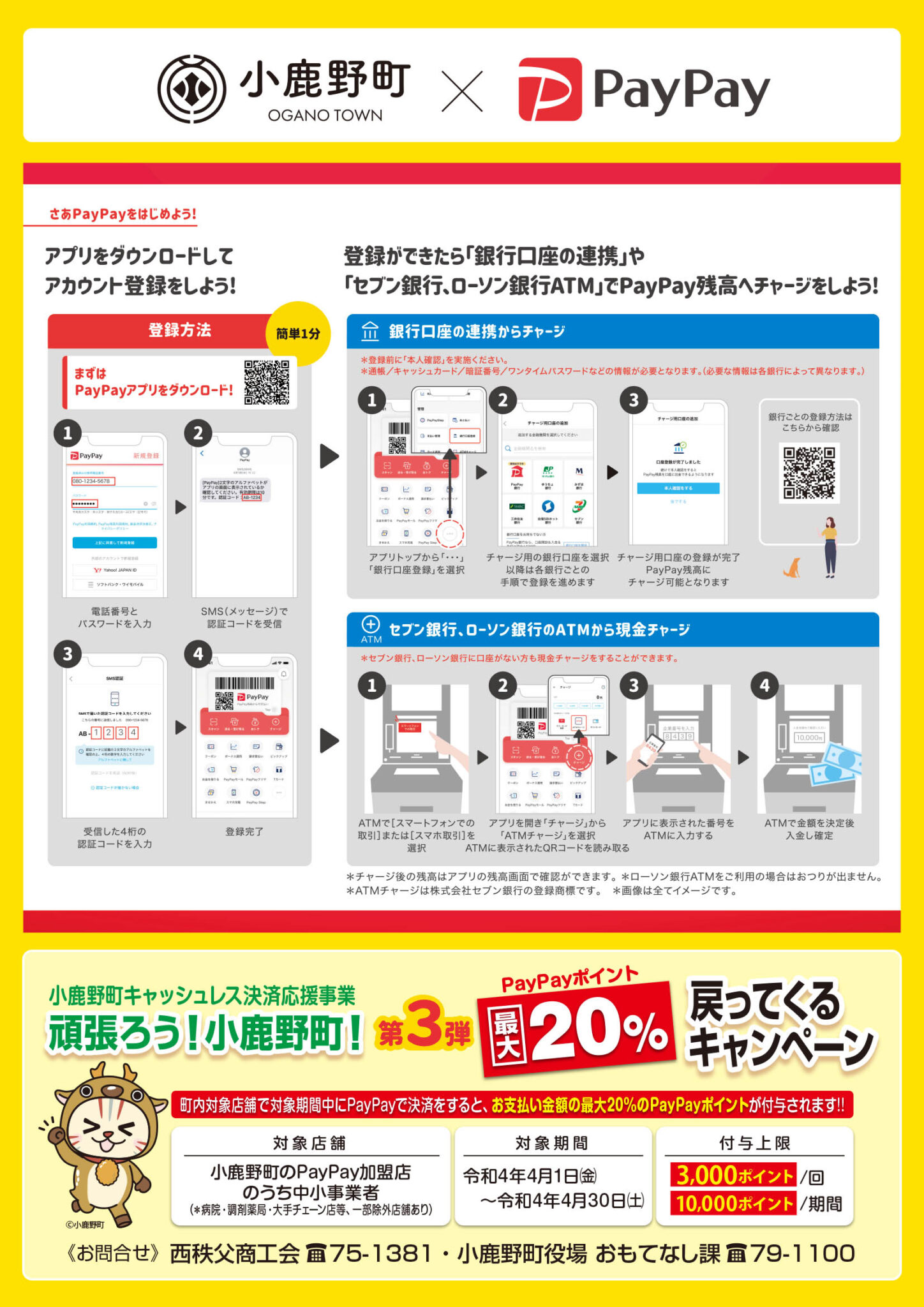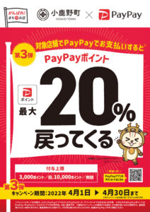 内容 小鹿野町内の対象店舗で対象期間中にPayPayで決済をすると、お支払い金額の最大20%のPayPayボーナスが付与されます。
