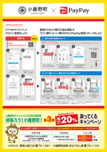 新型コロナウイルス感染症拡大の影響を受けた小鹿野町の地域消費を喚起し、感染予防の観点から現金の授受による接触が起こらない「キャッシュレス決済」を促進させるため、「PayPay」との連携キャンペーンを下記のとおり開催します。