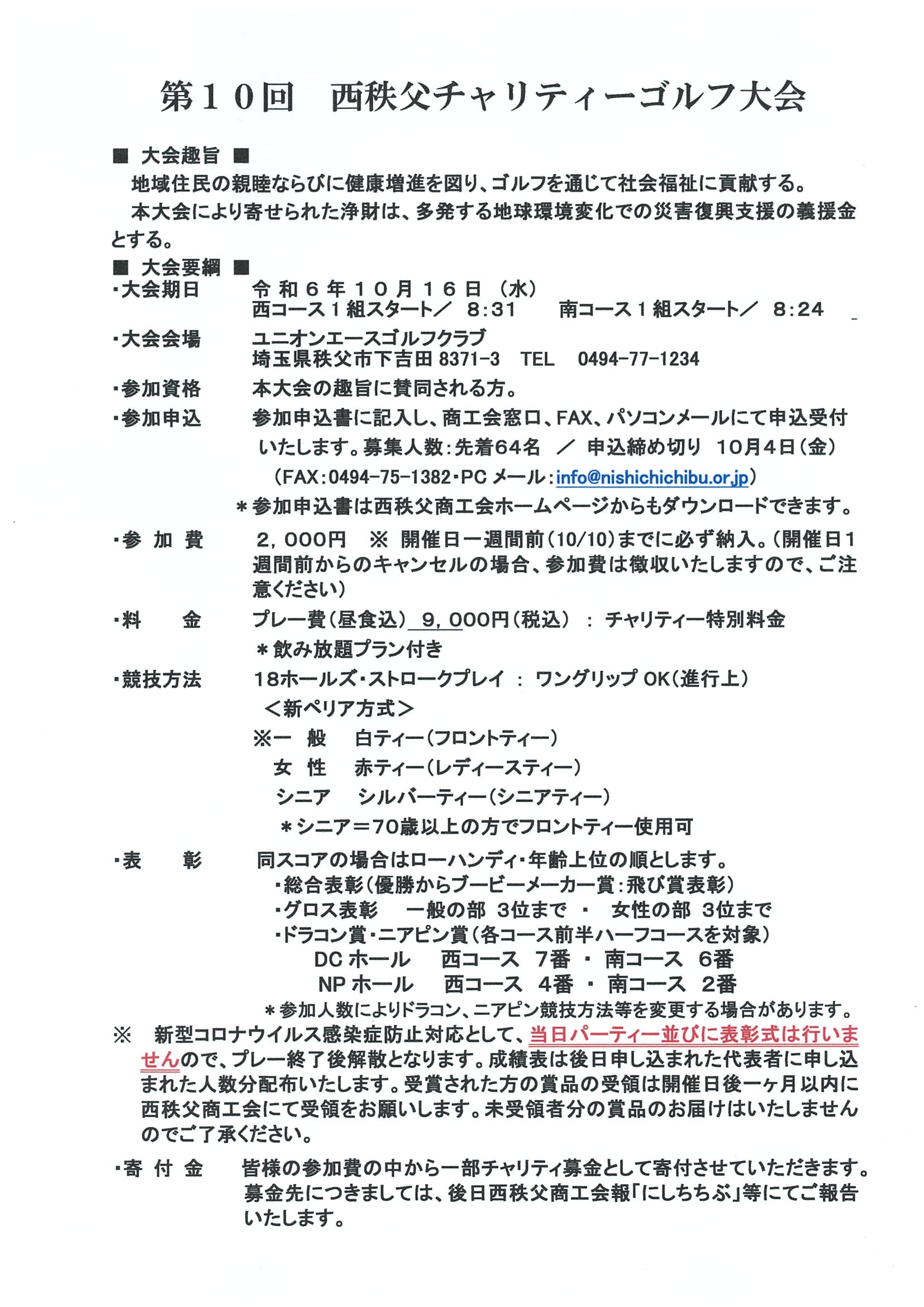 10月16日(水)、ユニオンエースゴルフクラブにおいて西秩父商工会主催の第10回西秩父チャリティゴルフ大会を開催いたします。下記の大会概要をご確認の上、参加申し込みをお願いいたします。<参加申込> 添付ファイルをプリントアウトし、ご記入のうえFAXまたはメールにてお申込みください。⇒参加申込書FAX番号/0494-75-1382 メールアドレス/info@nishichichibu.or.jp<主 催> 西秩父商工会 ℡/0494-75-1381