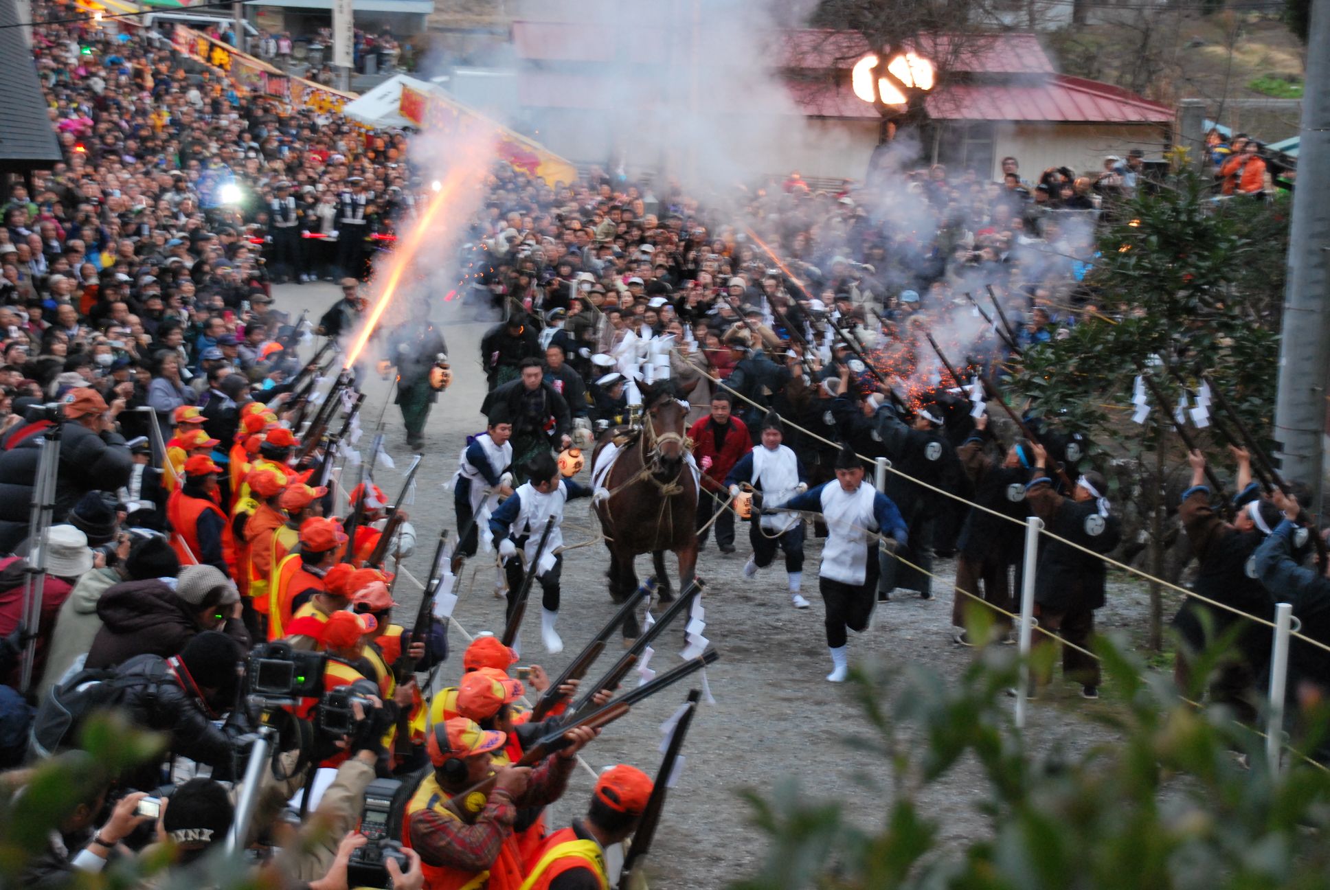 傘鉾の引き回しが行われ、13日には更に火縄銃の演舞や神楽奉納も見ることができます。