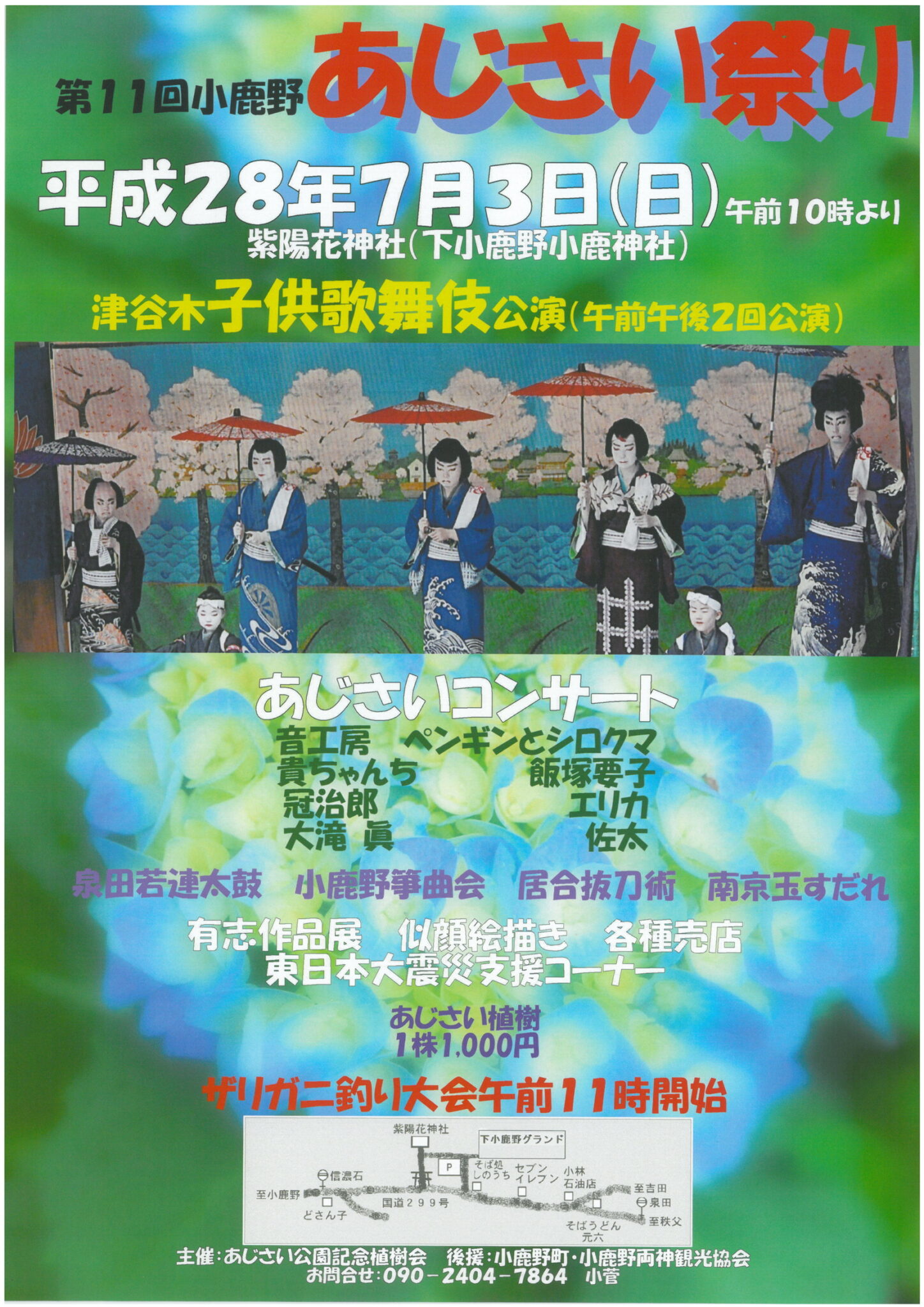 7月6日に下小鹿野の小鹿神社にて第11回あじさいまつりが開催されます。小鹿神社は平成18年から有志によるあじさいの植樹が行われ、6月から7月にかけては多くのあじさいを見ることができるようになっています。