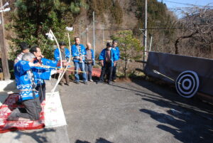 農作物の豊凶に影響を及ぼす1年の天気を予知するため、諏訪神社の祭礼神事として 毎年2月25日におこなわれるもので直径約80cmの的に篠竹製で矢羽根に諏訪神社と 小鷹神社の区別をつけて作った4本の矢を射り、その年の天気を占います。 的の白い所に矢が多くあたると晴天の年に、黒は雨の多い年 的はずれが多いと大風が吹くと言われています。