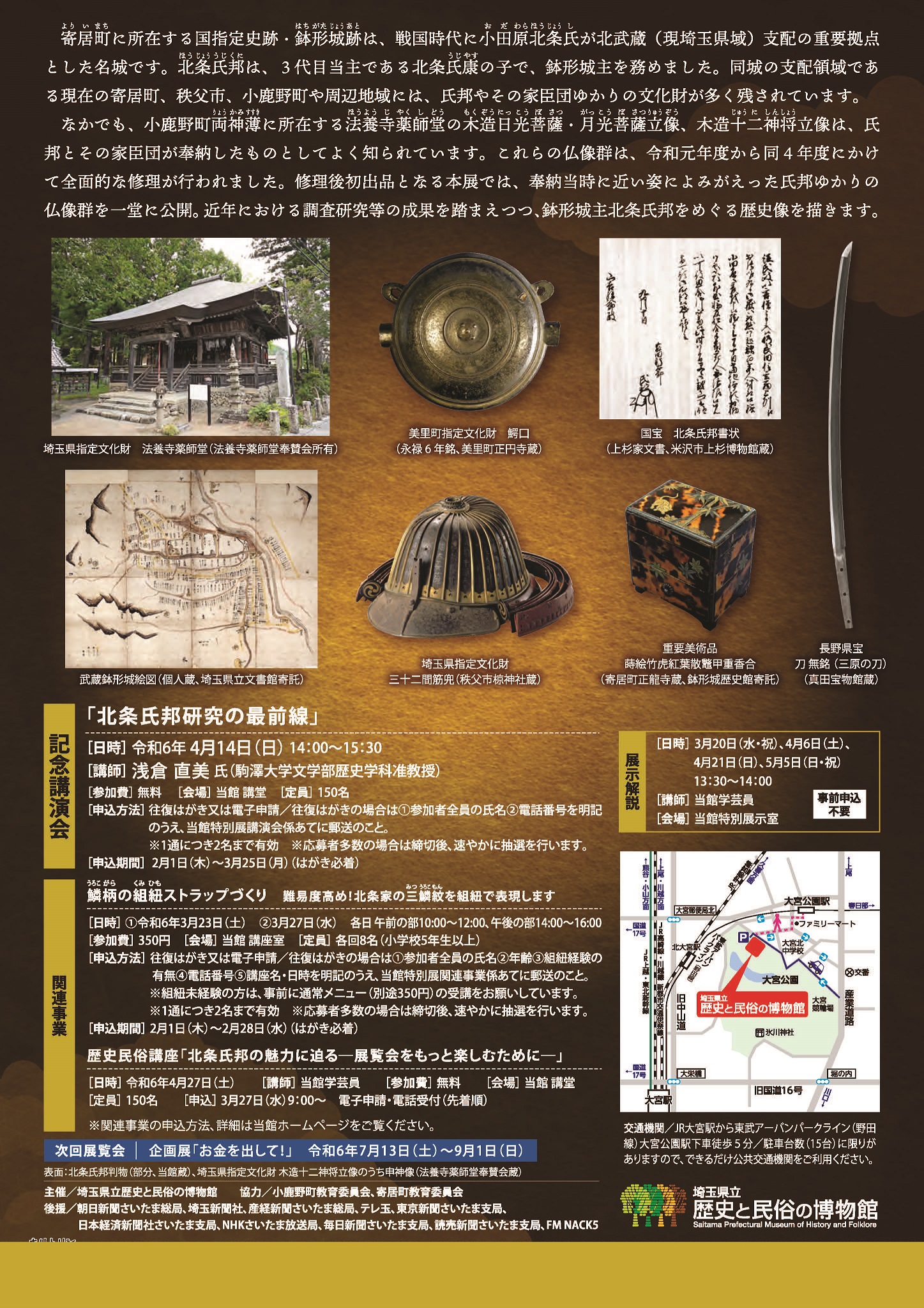 本展では、鉢形城(寄居町)の城主であった北条氏邦と、その家臣団ゆかりの文化財を紹介します。氏邦とその家臣団が奉納したとされる法養寺薬師堂(小鹿野町)の木造日光菩薩・月光菩薩立像、木造十二神将立像を一堂に公開。近年における研究成果を踏まえつつ、北条氏邦をめぐる歴史像を描きます。